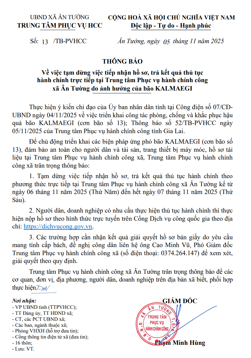 Tạm dừng việc tiếp nhận hồ sơ, trả kết quả thủ tục hành chính trực tiếp tại Trung tâm Phục vụ hành chính công xã Ân Tường do ảnh hưởng của bão KALMAEGI